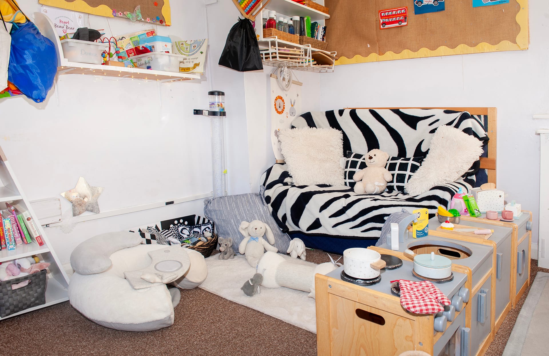 Baby Bluebells Room aims to create a home from home environment, which stimulates, nurtures and provides babies with the resources and enhancements they need to develop to their full potential. Our room is split into four areas of continuous provision: comfy, creative, imaginative and physical. We provide our babies with ample opportunities to develop their senses as they play in foam, spaghetti and sand; and make marks using their fingers and gross motor skills; use their imagination and imitate home life experiences in the home corner; As well as having the space to rest, relax and learn new vocabulary in the book area. In the physical area we plan space to move, roll, stretch and use low level equipment, supporting pulling themselves up to a standing position, and cruising along furniture, as well as free space to crawl. We also offer opportunities to dance, sing and play musical instruments- all of which encourage creativity. Heuristic play develops curiosity and gives babies a chance to openly explore without interruption. Each of these areas do overlap, and the room is often interchanged regularly, to ensure constant stimulation and engagement.
